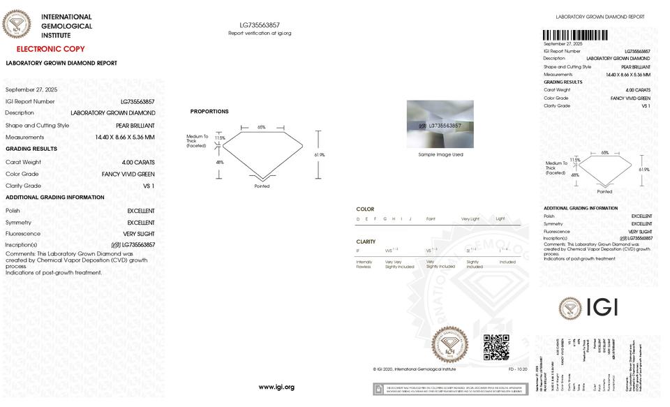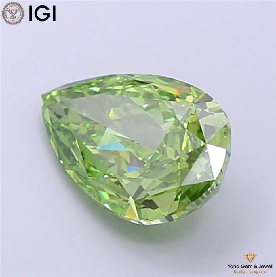 เพชรคุณภาพสูง 4.00 กะรัต ผลิตในห้องปฏิบัติการด้วยวิธี CVD ความใส VS1 สีเขียวสดใสทรงลูกแพร์ พร้อมใบรับรอง IGI สำหรับแหวนลายเซ็น