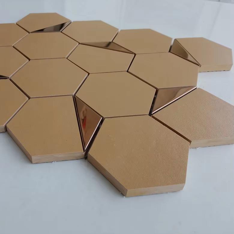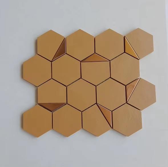 กระเบื้องเซรามิกเคลือบเงาและด้าน รูปหกเหลี่ยม ขนาด 73 มม. สีเงิน PVD คุณภาพสูง สำหรับผนังห้องครัวและมุมอาบน้ำ มีจำหน่ายสำหรับขายส่ง