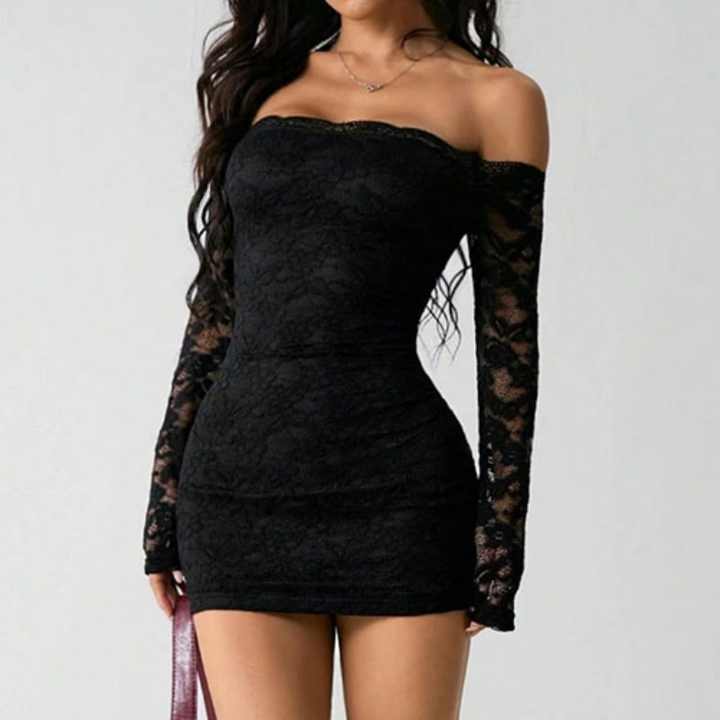 เดรสลูกไม้แขนยาวเปิดไหล่ทรงมินิสำหรับผู้หญิง คุณภาพเยี่ยม สไตล์ลำลอง ดีไซน์หรูหรา กระชับเข้ารูปช่วงเอว