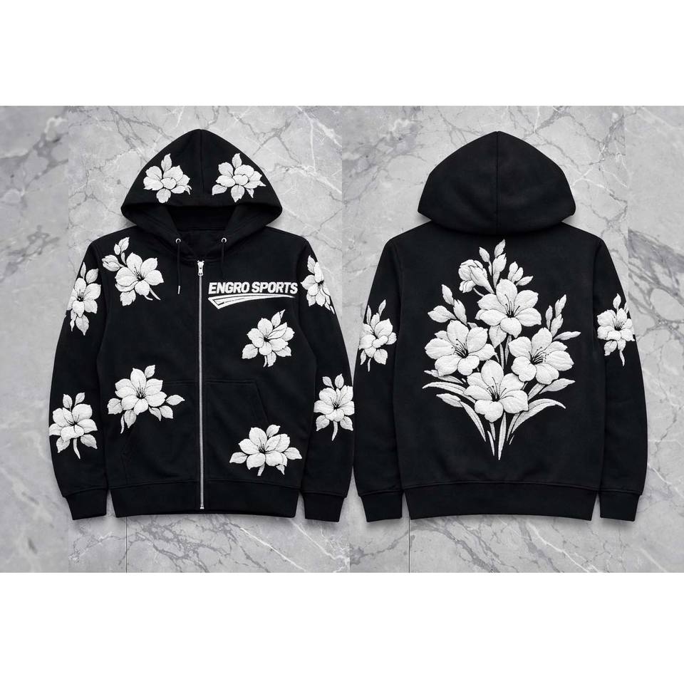 เสื้อฮู้ดซิปสีดำพิมพ์ลายคุณภาพสูงแบบกำหนดเอง ผู้ผลิตชุดกีฬา OEM ลายดอกลิลลี่สีขาว