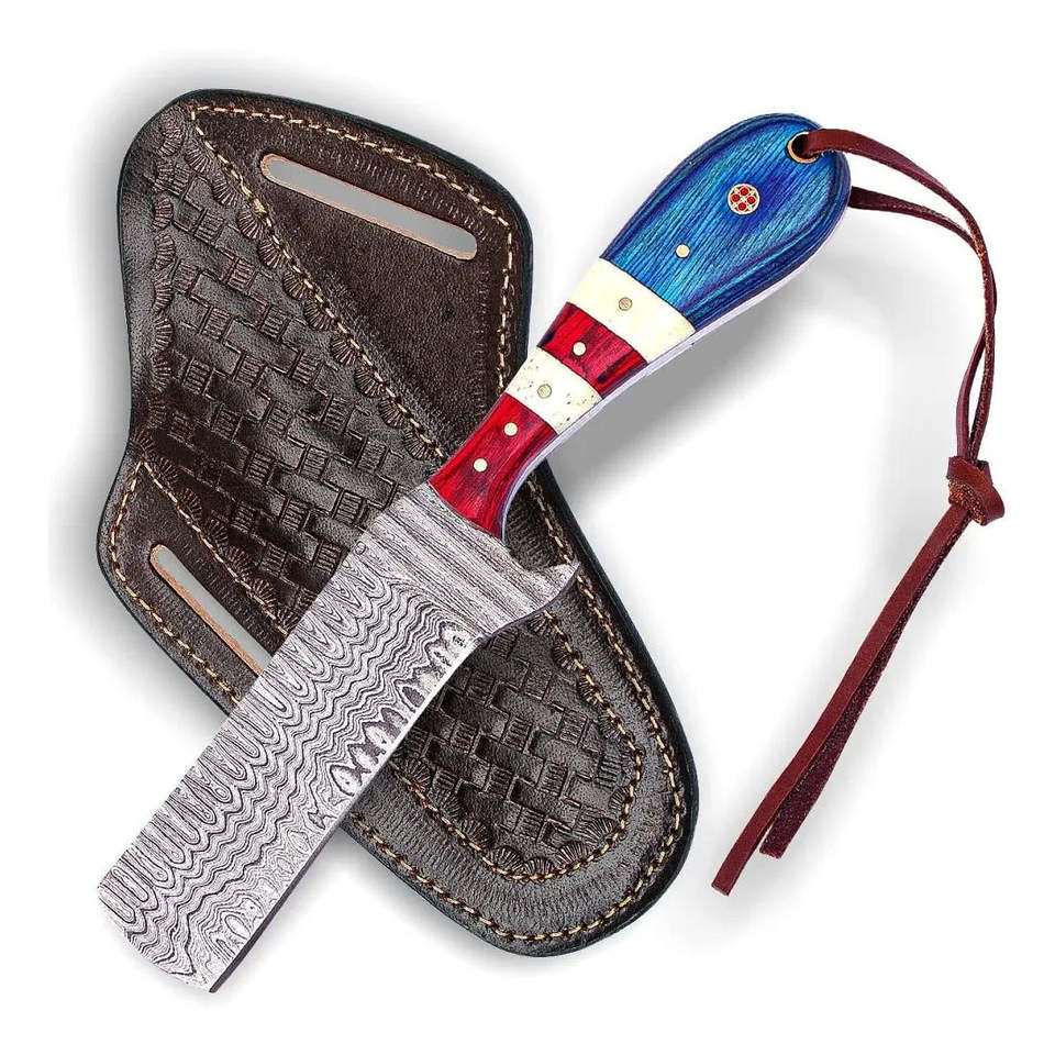 มีดคัตเตอร์เหล็กดามัสกัสคุณภาพสูง มีดคาวบอยใบตายสำหรับตั้งแคมป์และล่าสัตว์ พร้อมปลอกหนัง มีดพกพา EDC สำหรับล่าสัตว์