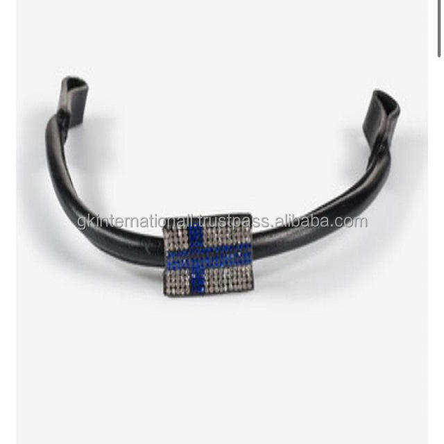 แถบคิ้วหนังแท้คุณภาพสูงในหนังสีดำนุ่มเย็บหรูหราด้วยคริสตัลธงแนบ