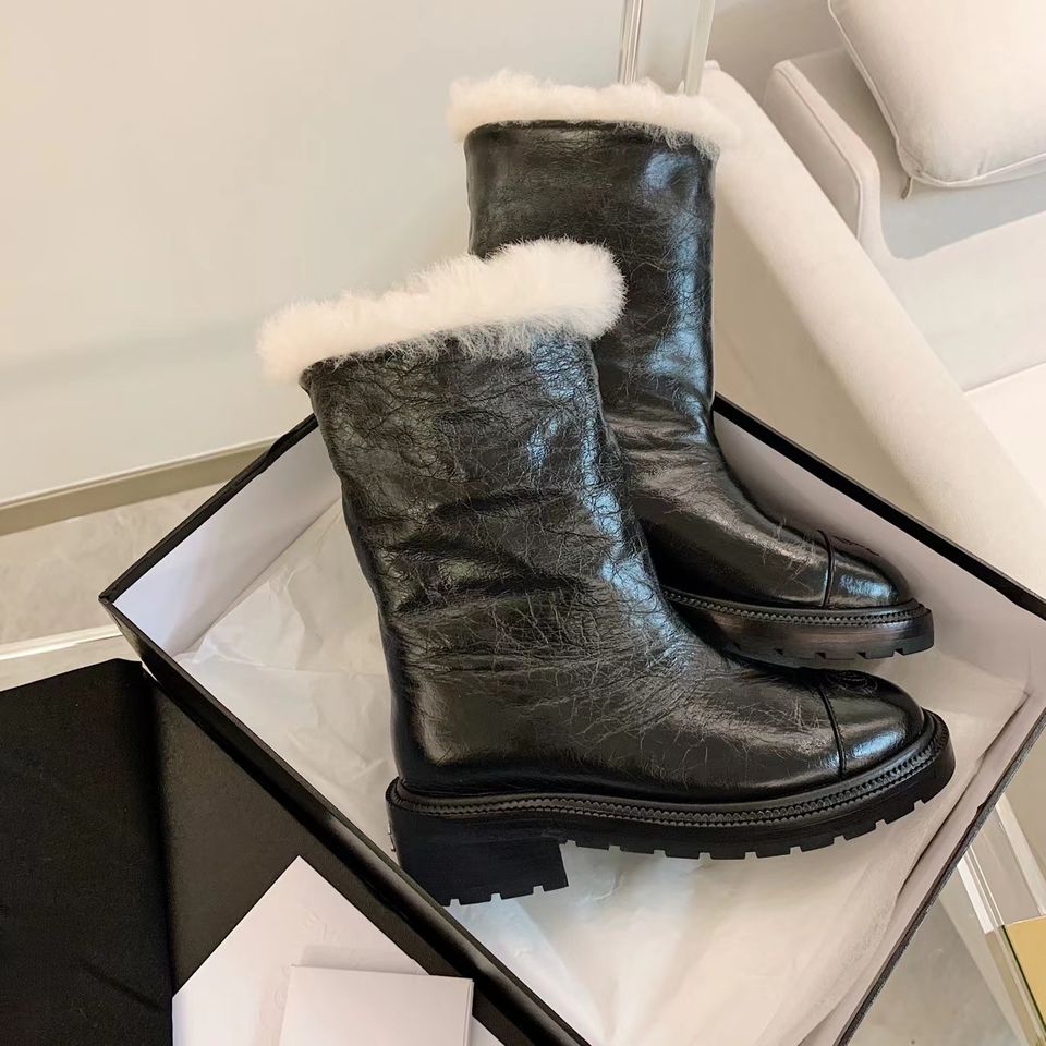 064kza736ผู้หญิงขนสัตว์สีดำหนังแท้รองเท้าบูทคลาสสิก
