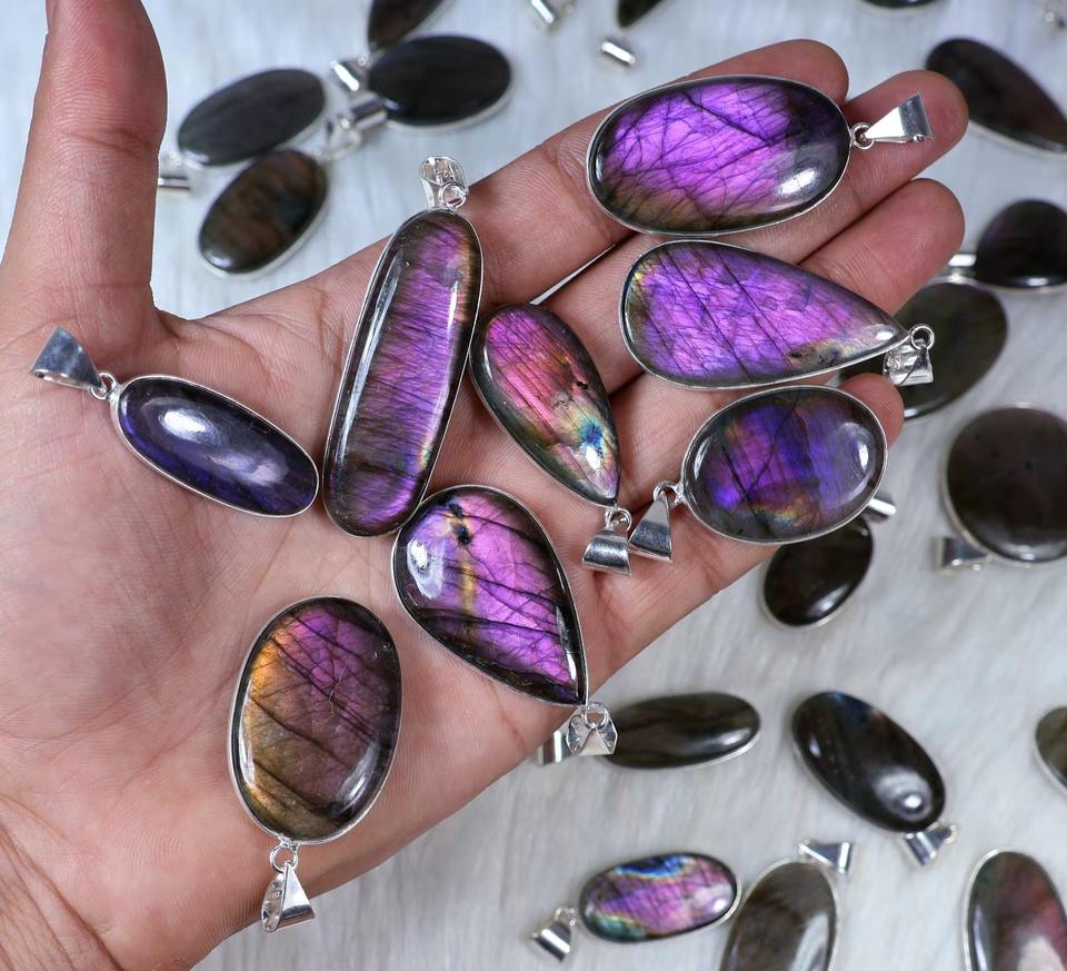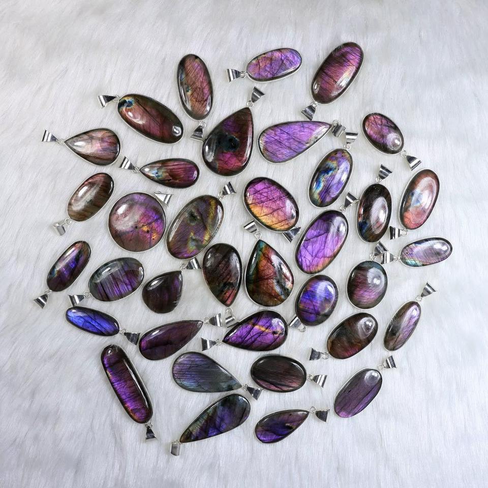 จี้สร้อยคอลาบราดอไรต์สำหรับผู้หญิงจี้อัญมณีลาบราดอไรต์สีม่วง