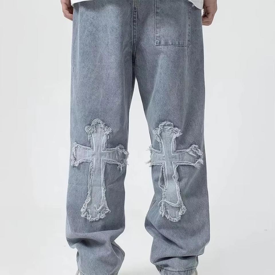 กางเกงยีนส์ทรงหลวมสำหรับผู้ชายทรงตรงปักโลโก้ได้