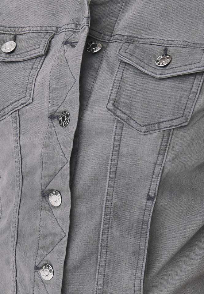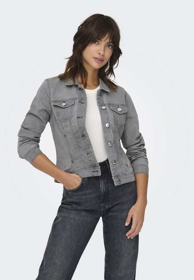 เสื้อแจ็กเก็ตผ้าเดนิมสีเทาคุณภาพปานกลางมีกระเป๋าคาดหน้าอกและกระดุมที่ออกแบบมาสำหรับผู้หญิงทุกฤดูกาล