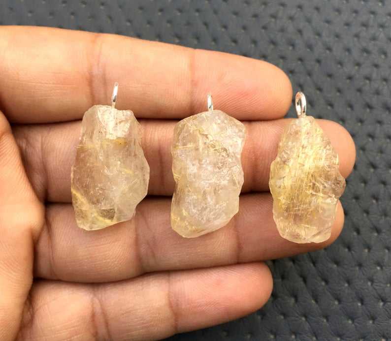 พลอยหยาบธรรมชาติทับทิมสีทองไม่ผ่านการบำบัด3ชิ้นจี้ทำด้วยมือสีเงินสเตอร์ลิง92.5ขายส่ง