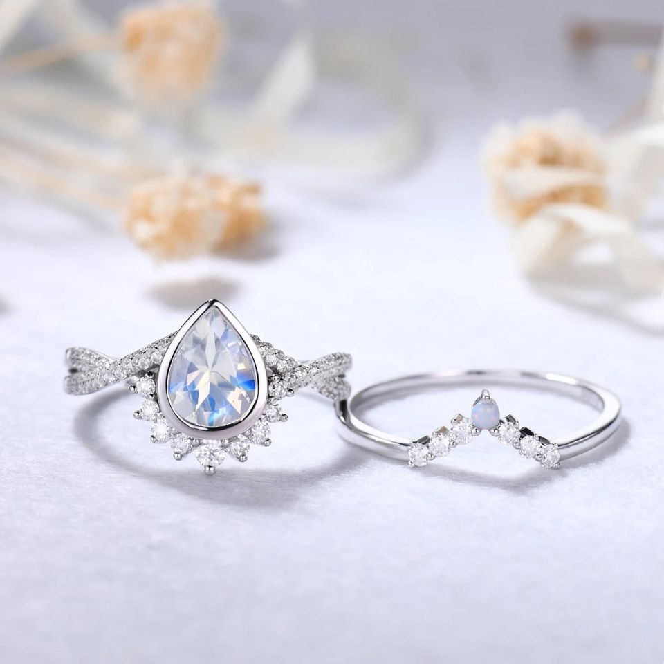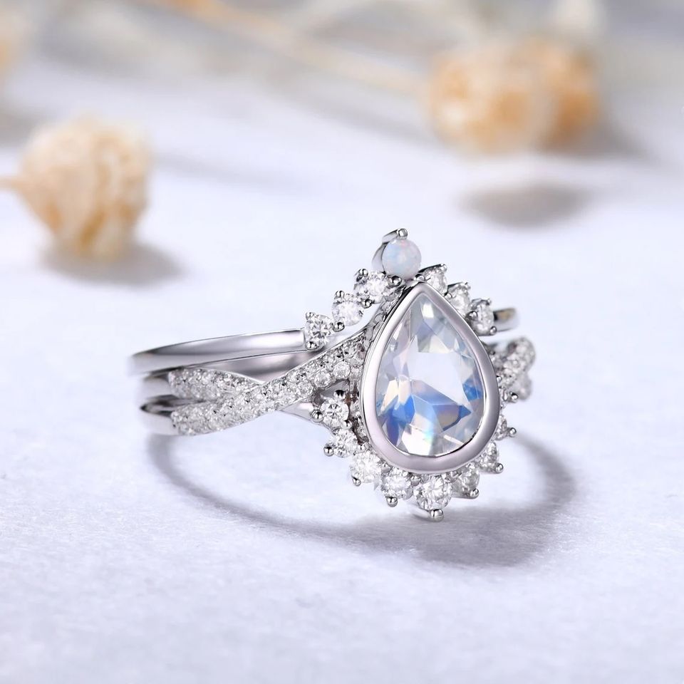 หินพลอยมูนสโตนสีรุ้งธรรมชาติดีไซน์ใหม่หรูหราเครื่องประดับทอง14kt แข็งปรับแต่งแหวนเพชรจริง