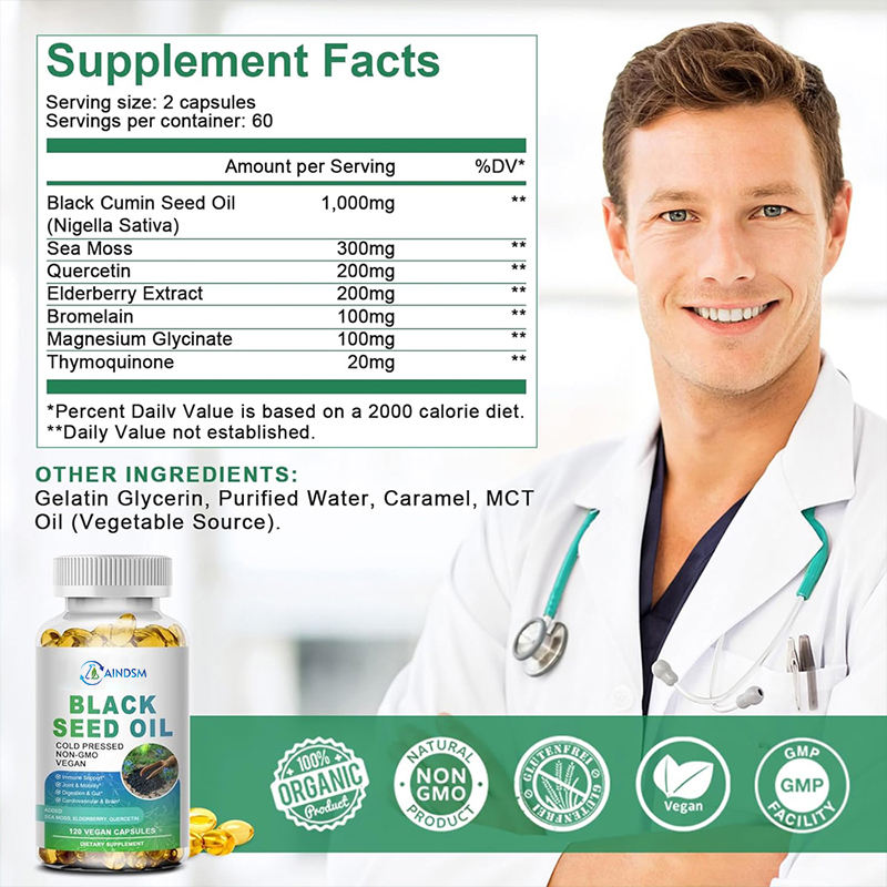 แคปซูลน้ำมันเมล็ดดำเอลเดอร์เบอร์รี่คุณภาพสูง ช่วยย่อยอาหาร สำหรับผู้ทานมังสวิรัติ ควอเรซ์ทิน บำรุงข้อต่อและการเคลื่อนไหว น้ำมันเมล็ดดำผสมสาหร่ายทะเลแบบซอฟต์เจล