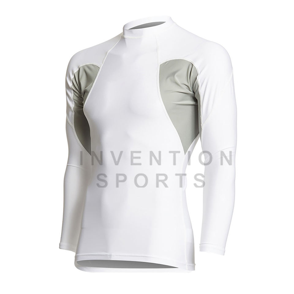 ชุดป้องกันผดผื่นสำหรับผู้ชายชุดป้องกันผื่นคันสีขาวมีแผ่นกันผดผื่นป้องกัน UV แห้งเร็วโลโก้ตามสั่ง
