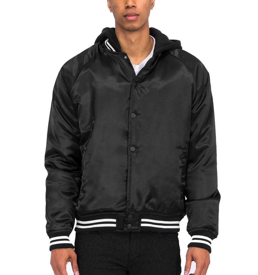 เสื้อแจ็กเก็ตเบสบอลผ้าซาตินสำหรับผู้ชายเสื้อแจ็กเก็ตแบบมีฮู้ดสำหรับใส่ไปมหาวิทยาลัยมหาวิทยาลัยระบายอากาศได้ดีเสื้อแจ็คเก็ตบอมเบอร์ขนแกะมีฮู้ดสำหรับฤดูหนาว