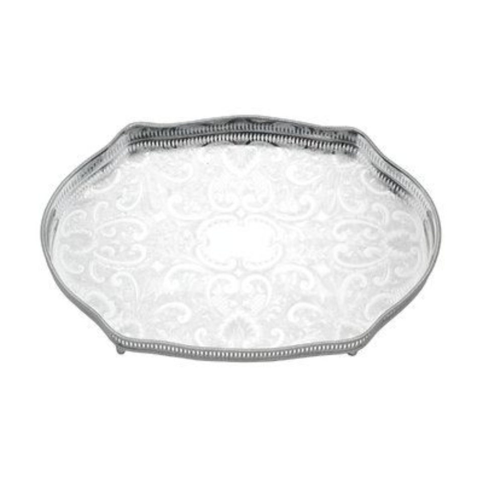 ถาดเสิร์ฟรูปวงรีชุบเงินคุณภาพสูง พร้อมลวดลายแกะสลักประณีตและหูจับคู่ ถาดตกแต่งทำมือ