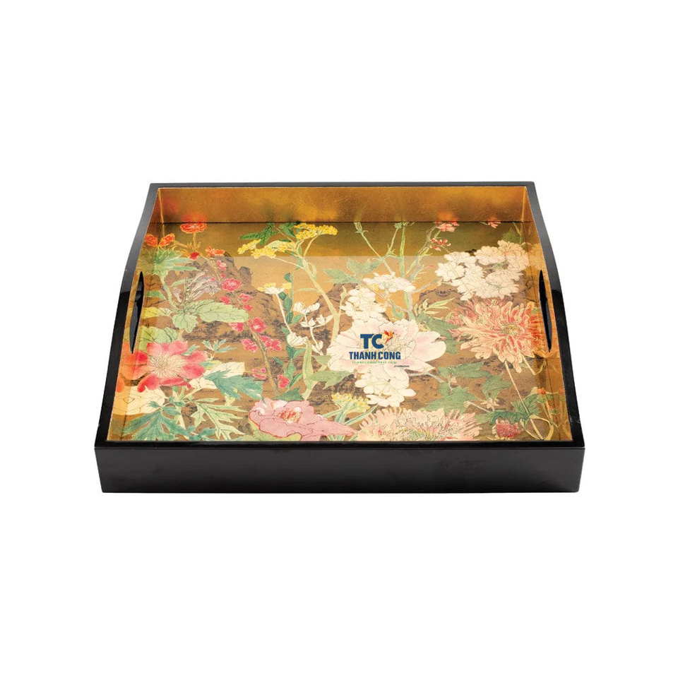 ถาดเสิร์ฟแล็กเกอร์ MDF ทรงสี่เหลี่ยมพร้อมดีไซน์ดอกไม้หรูหราสำหรับร้านอาหารโรงแรมและร้านกาแฟสุดหรู