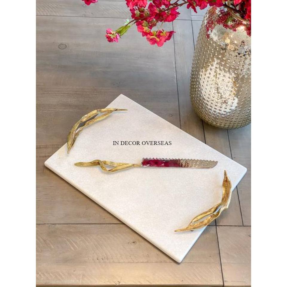 ถาดเสิร์ฟทรงสี่เหลี่ยมผืนผ้าทำจากหินอ่อนสีขาวพร้อมด้ามจับโลหะชุบทอง