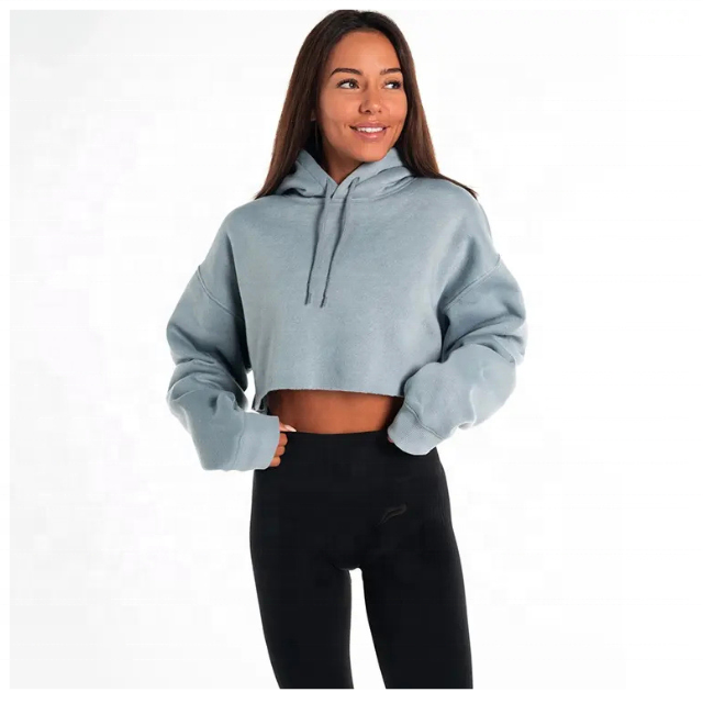 เสื้อครอปมีฮู้ดแบบปรับแต่งได้สำหรับผู้หญิงเสื้อครอปแบบมีฮู้ดผ้าคอตตอนปักลาย