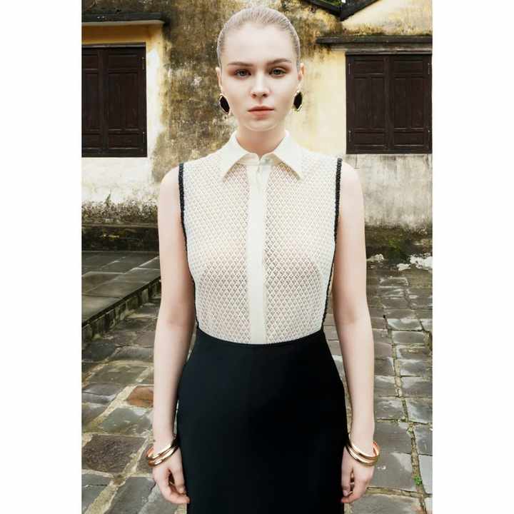 ชุดเสื้อผ้าสไตล์เรียบง่ายสำหรับผู้หญิงเสื้อลูกไม้มีปกและสายประดับลูกปัด