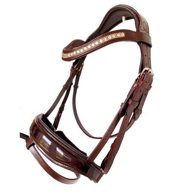 คุณภาพสูงและหนังแท้คุณภาพเยี่ยมพร้อมแถบคิ้วคริสตัลสีทอง8มม. และบังเหียนฮาโนเวอเนียนสีน้ำตาลพร้อมสายคาดจมูกสิทธิบัตร