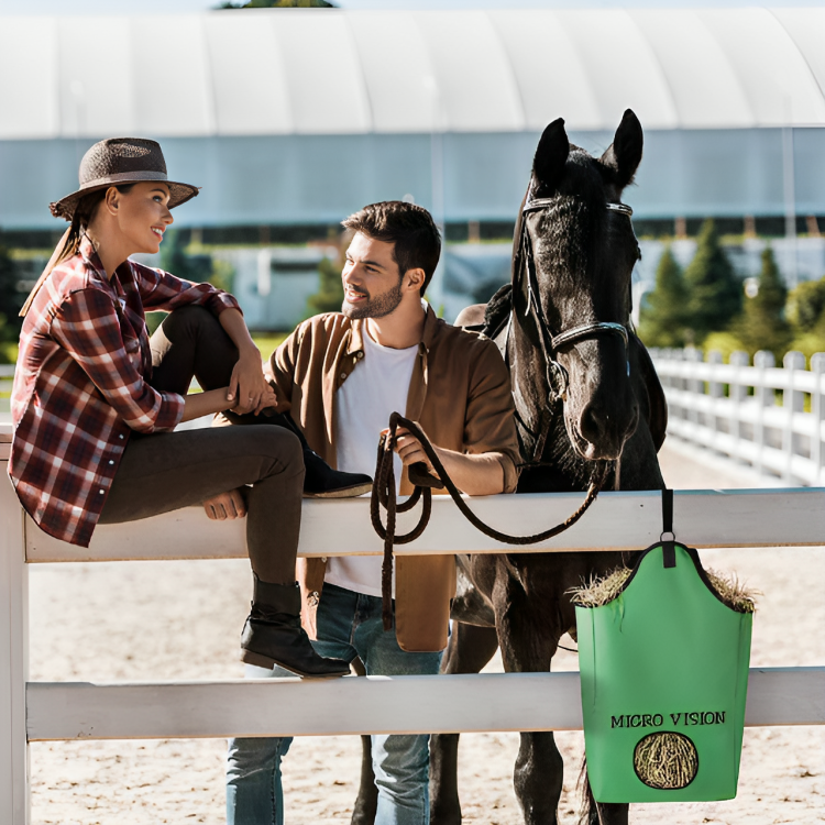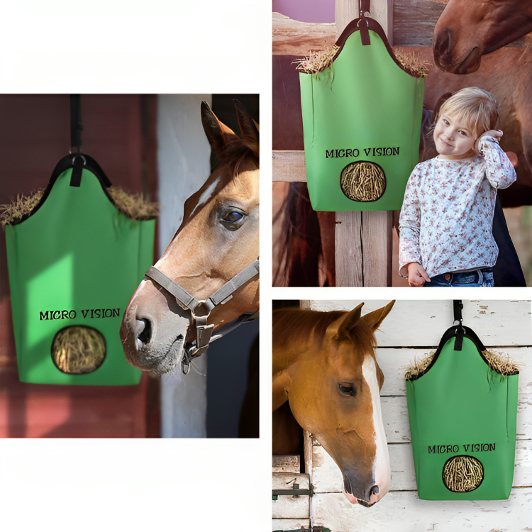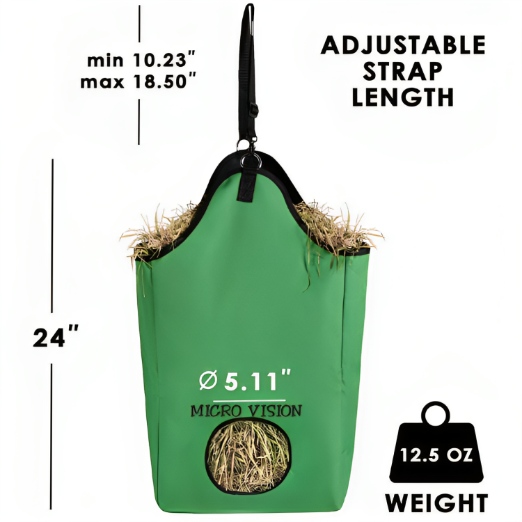 ถุงหญ้าแห้งสำหรับม้าคุณภาพสูง สีสันตามสั่ง ผลิตจากโลหะและเหล็ก พร้อมผ้าระบายอากาศ ทนทาน ช่วยให้กินอย่างช้าๆ
