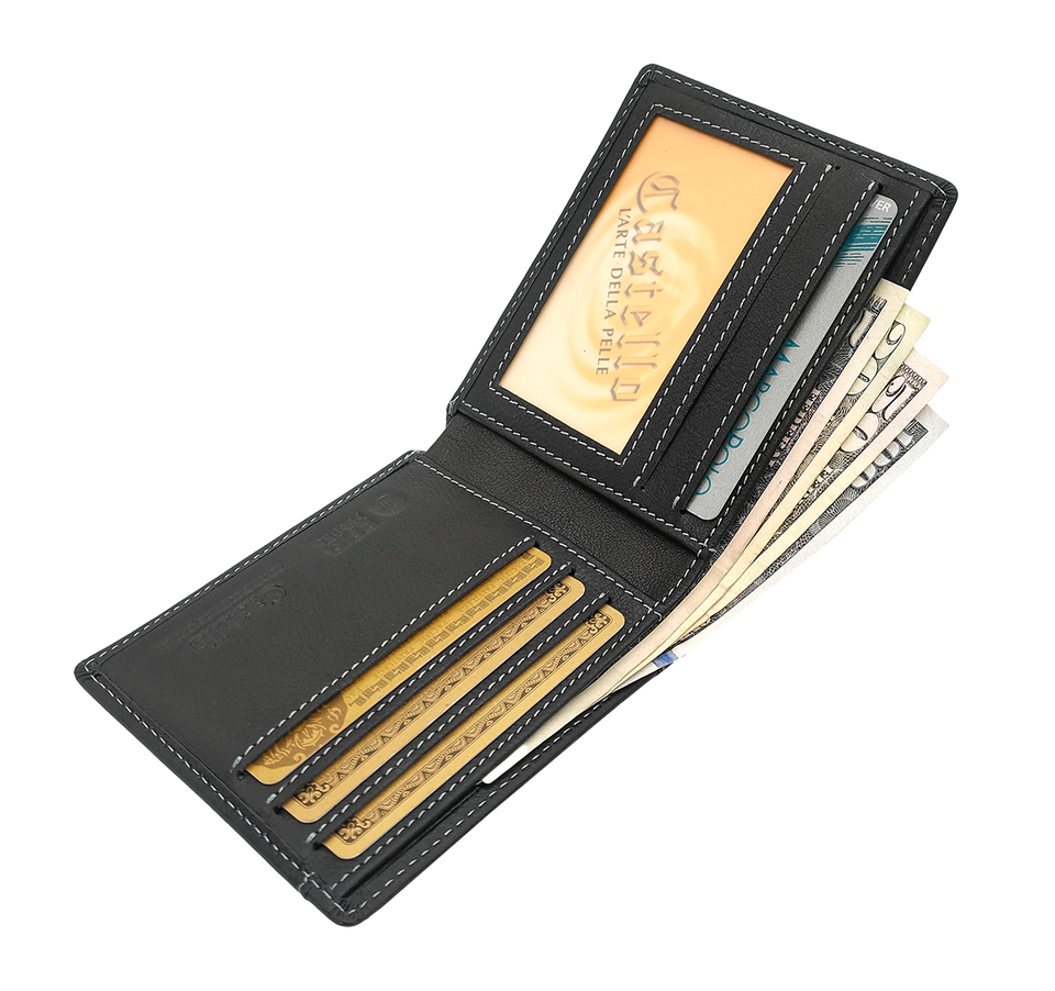 กระเป๋าสตางค์ผู้ชาย Castello หนังวัวแท้ นุ่ม ยี่ห้อดัง รุ่น RFID Slim Bi-fold แบบเปิดสั้น บุโพลีเอสเตอร์ สีดำ สีน้ำตาลเข้ม