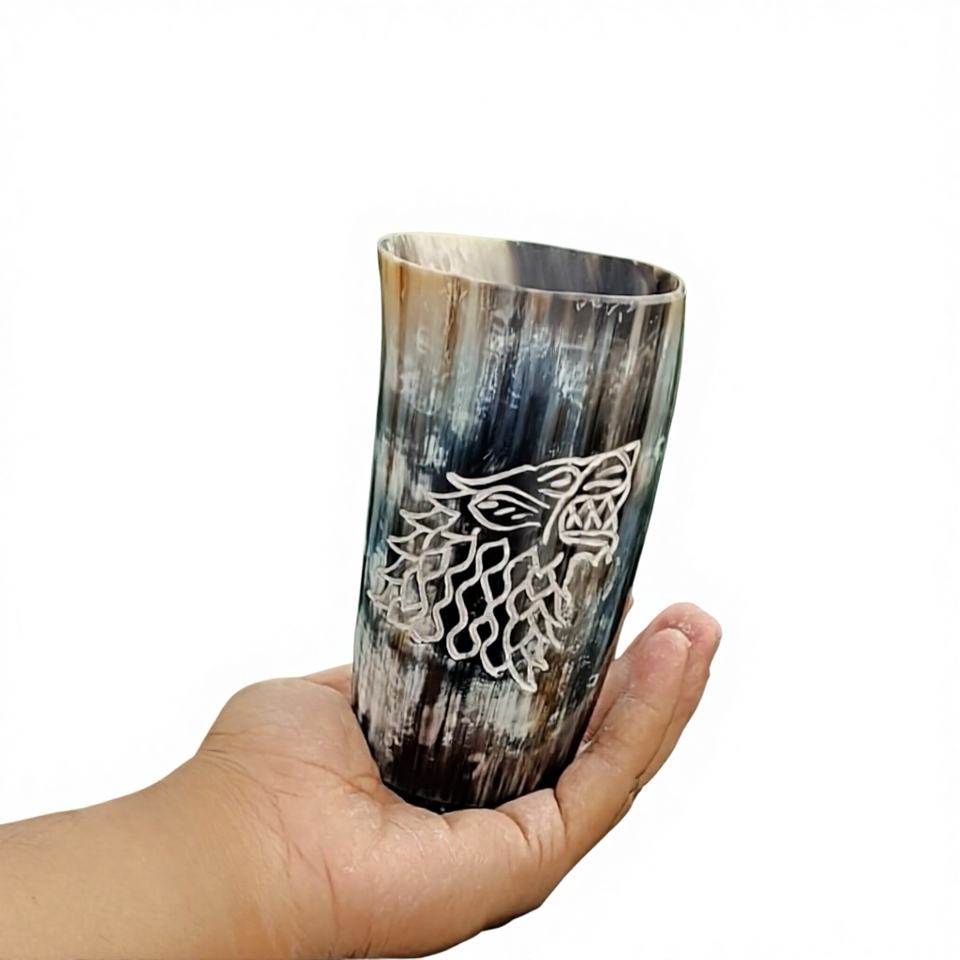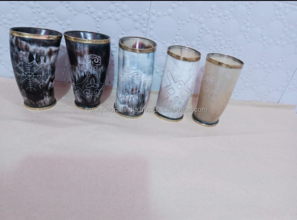 แก้วน้ำเขาสัตว์ขัดเงาแบบเป็นมิตรกับสิ่งแวดล้อม ขายดีอันดับต้นๆ ทำจากเขาควายธรรมชาติ พร้อมฐานไม้ แท้สไตล์ยุคกลาง