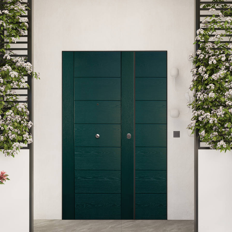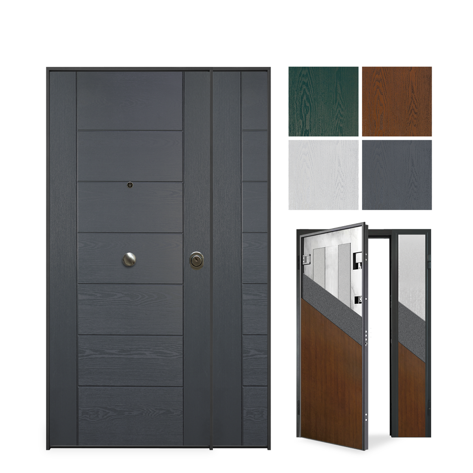 ประตูรักษาความปลอดภัยแบบใบไม้คู่พร้อมแผงไฟเบอร์กลาสภายนอกรุ่น Helios ดีไซน์ทันสมัย