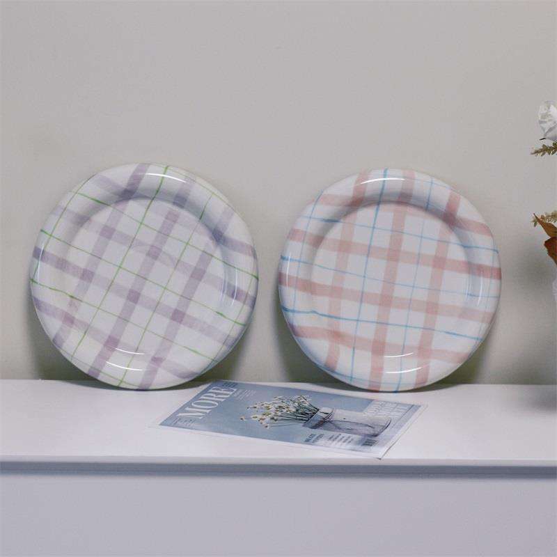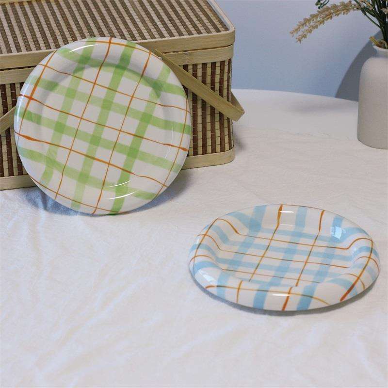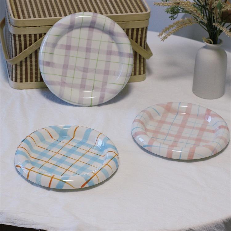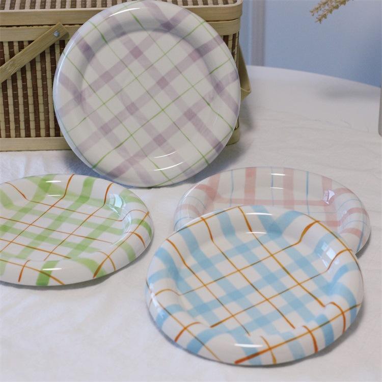 Top Seller Eco-Friendly Cute Hand-painted Pottery Ceramic Plate Macaron Colors Plaid Design for Gift Fruit Dessert Pasta Salad