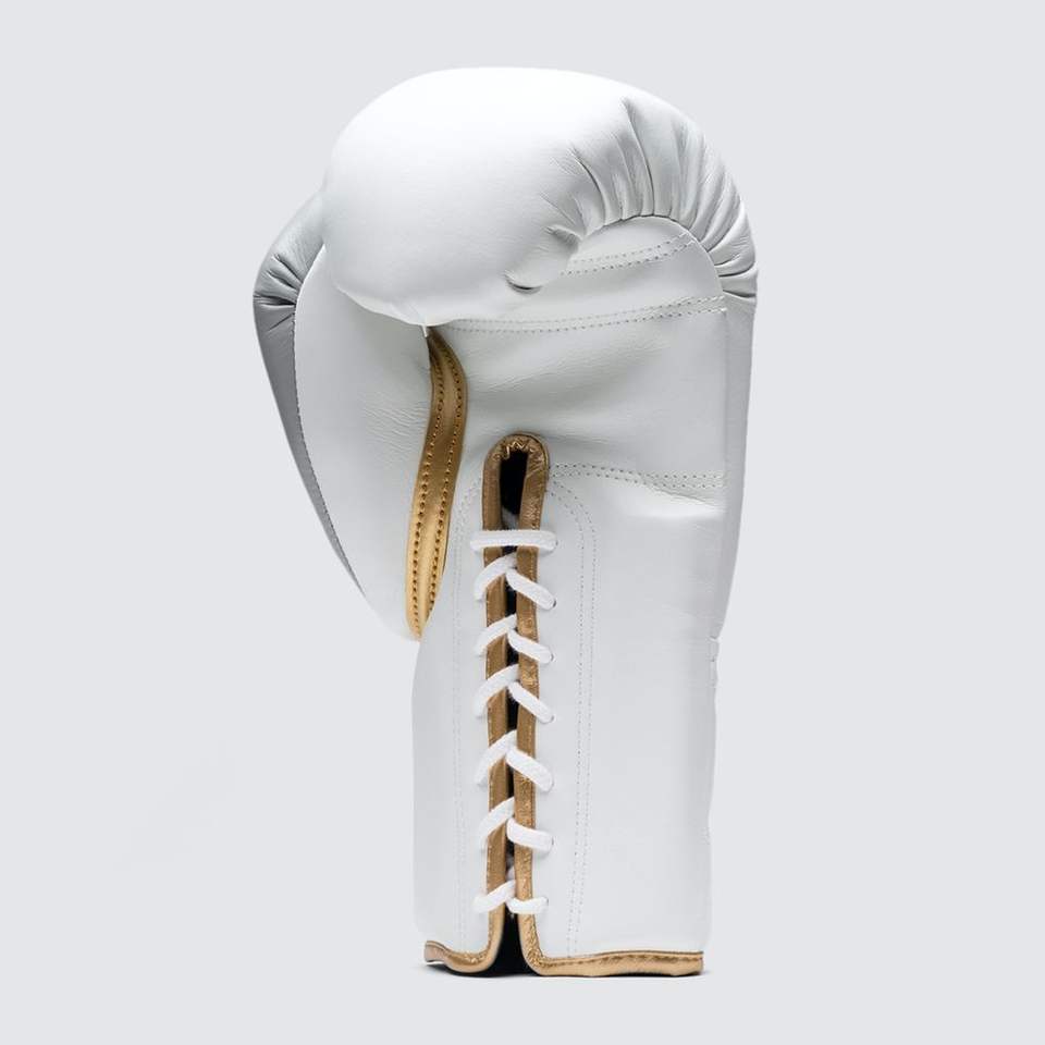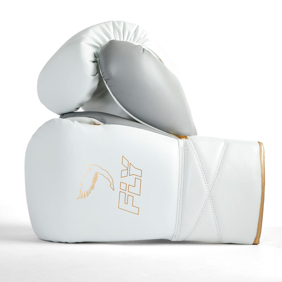 ถุงมือชกมวยรุ่นยอดนิยมปี 2026 สำหรับฝึกซ้อม คุณภาพพรีเมียม หนังแท้ รุ่น Fly Super Lace สีขาวและสีเงิน