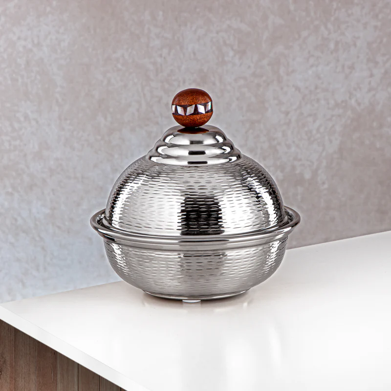 เซิร์ฟเวอร์อาหารทำจากสเตนเลสสตีลและไม้พร้อมที่จับทองเหลืองลายดอกไม้หม้อร้อนและหม้อปรุงอาหารความจุ3L
