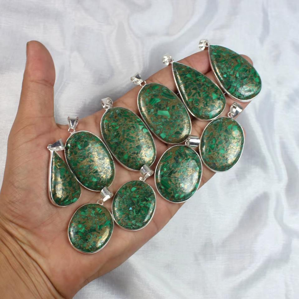 จี้ทองแดงมาลาไคต์ขายดีเครื่องประดับเงินจี้ฝาจี้ทองแดงมรกตสร้อยคออัญมณีสีเงิน