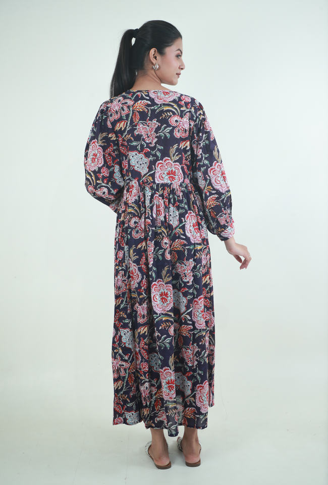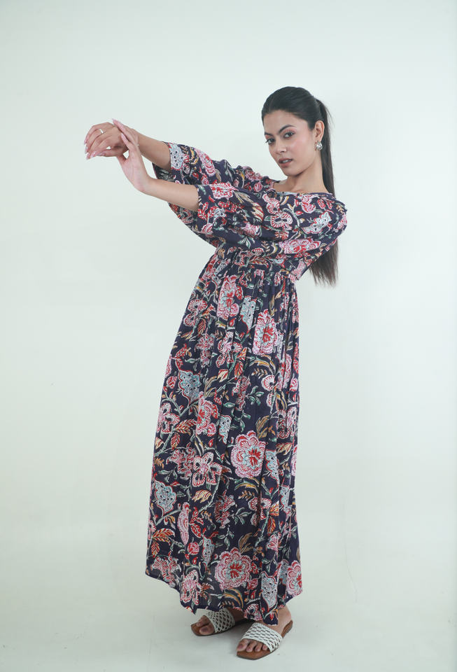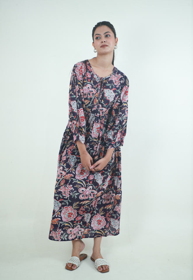 Top Selling Cotton Block Print Kaftan Dress Modest Long Handmade Floral Embroidery Loose Upto 54inch Wholesale Price for Spring