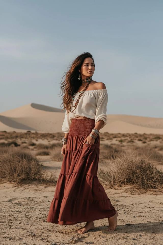 กระโปรงแม็กซี่สไตล์ฮิปปี้ขายดี ผ้าฝ้ายออร์แกนิคเนื้อผ้าก๊อซ ทรงระบายยาวพลิ้วไหว สไตล์โบฮีเมียน เหมาะสำหรับใส่ไปทะเล ของขวัญสำหรับเธอ