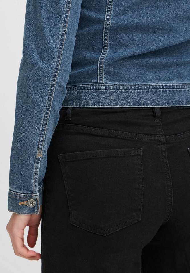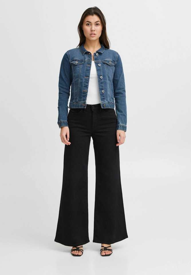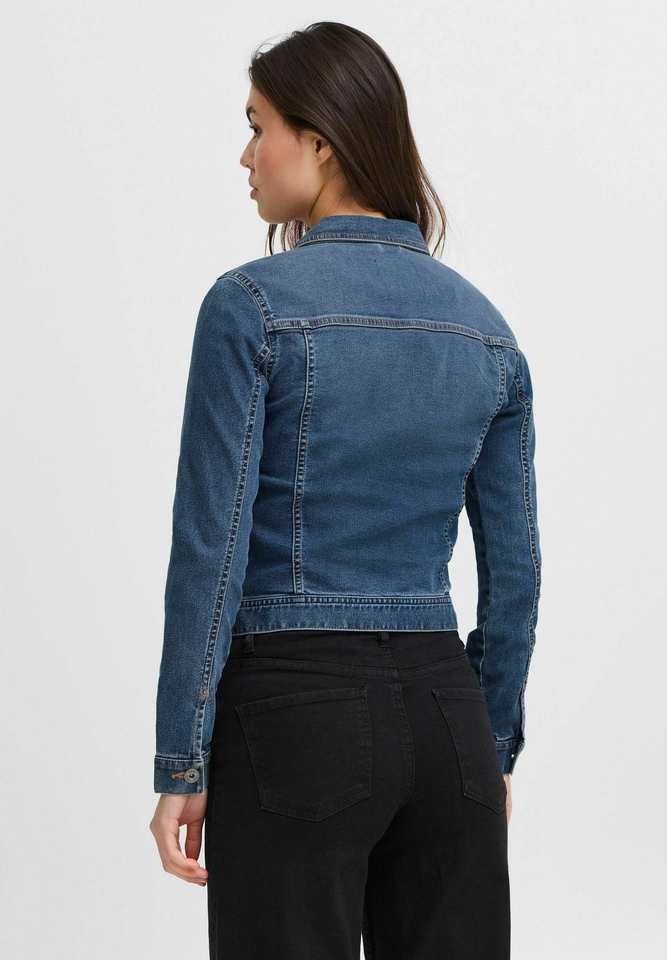 เสื้อแจ็กเก็ตผ้ายีนส์สำหรับผู้หญิงสีน้ำเงินปานกลางมีกระดุมและกระเป๋าหน้าอกที่ออกแบบมาสำหรับทุกฤดูกาล