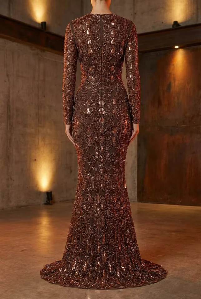 ชุดราตรีทรงเมอร์เมดประดับเลื่อมลายเรขาคณิต คอสูง แขนยาว แต่งลูกปัด สำหรับงานพรมแดง งานเลี้ยงคนดัง รุ่นขายดีประจำปี 2026