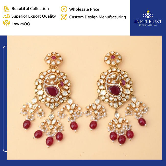 ต่างหูประดับเพชรโมอิสสีขาวและแดงดีไซน์นกยูงสวยงาม