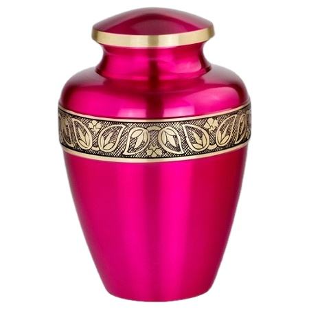 ชื่อผลิตภัณฑ์:โกศใส่ศพทองเหลืองสำหรับผู้ใหญ่สีชมพูเข้มและสลักลายใบไม้สีทองด้วยมือ