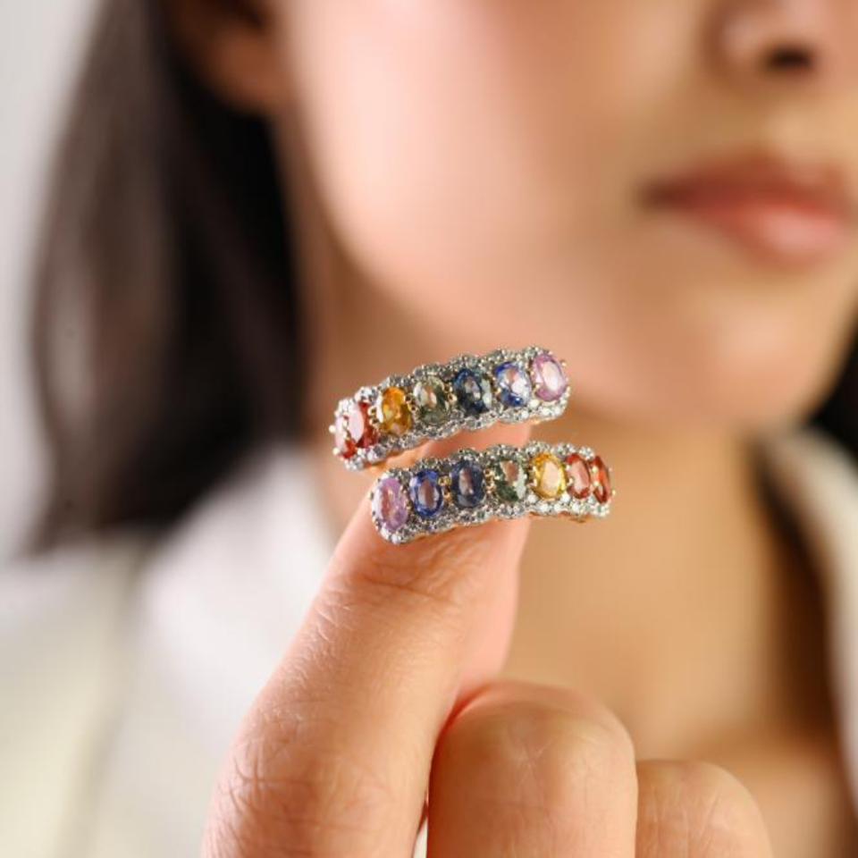 แหวนแต่งงานดีไซน์เก๋ประดับเพชรและแซฟไฟร์หลากสีรุ้ง ขายดีอันดับต้นๆ ทองคำแท้ 14K ประดับอัญมณีธรรมชาติ