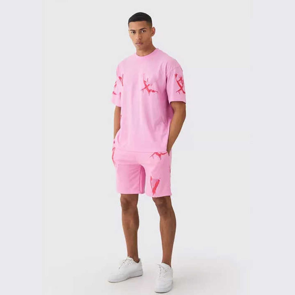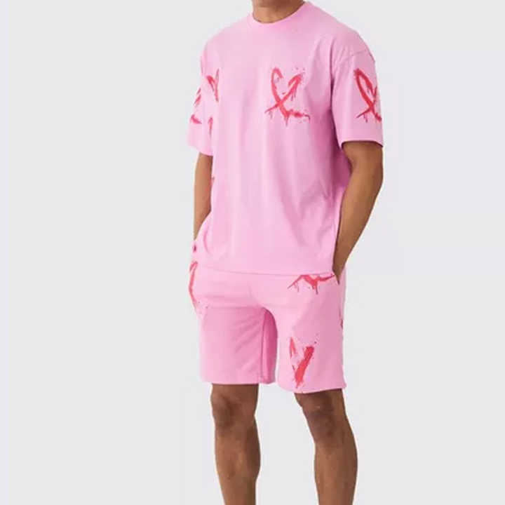 ชุดกางเกงขาสั้นผ้าคอตตอน100% พิมพ์ลายเสื้อกางเกงเข้ารูปชุดเสื้อผ้าคู่สำหรับผู้ชายผ้าคอตตอนพิมพ์โลโก้