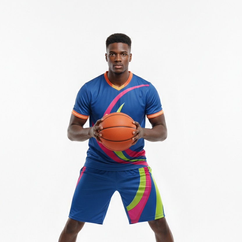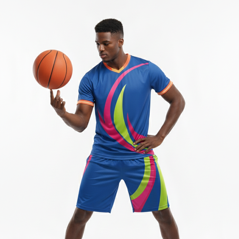ชุดบาสเก็ตบอลสีน้ำเงินคอวีพิมพ์ลายแบบซับลิเมชั่นสั่งทำพิเศษขายดีอันดับต้นๆ พร้อมกางเกงขาสั้น ขายส่ง