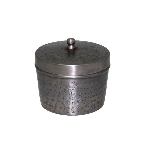 กล่องเหล็กทรงกลมสีเงินเก่าพร้อมฝาปิดแฮนด์เมด