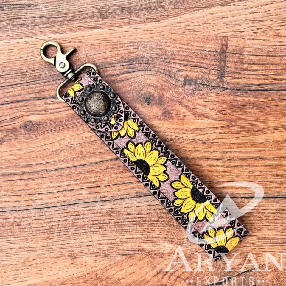 สายคล้องข้อมือหนังดอกทานตะวันแบบตะวันตกสายคล้องข้อมือสายคล้องพวงกุญแจหนังแท้ที่หนีบกุญแจของขวัญสำหรับผู้หญิง