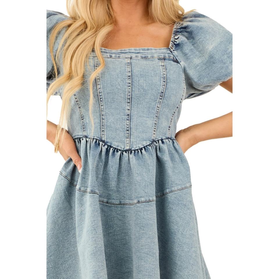เดรสยีนส์สั้นทรงเอ สไตล์ลำลอง คอเหลี่ยม แขนพอง เอวเข้ารูป ชายระบาย ขายดีสำหรับผู้หญิง