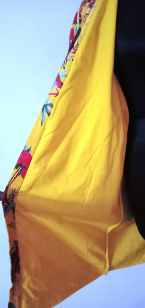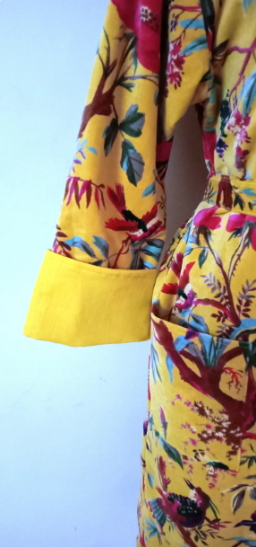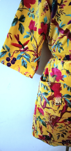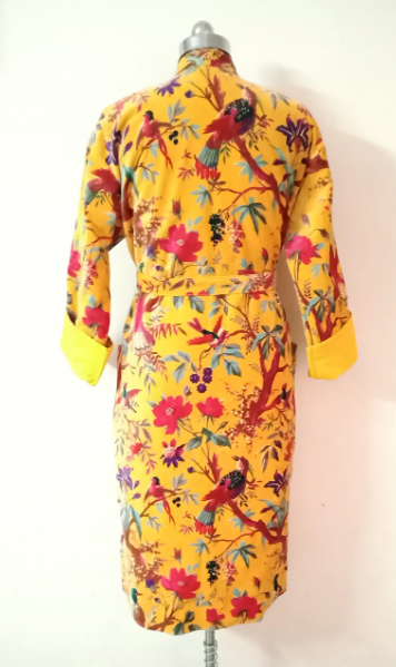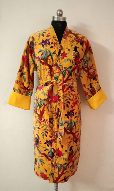 ชุดเดรสกิโมโนพิมพ์ลายนกทำจากผ้าฝ้ายกำมะหยี่สีเหลืองของขวัญที่สมบูรณ์แบบจากผู้ส่งออกอินเดีย