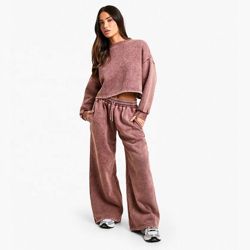 ชุดเซ็ตเสื้อฮู้ดและกางเกงขายาวผ้าฝ้ายเนื้อหนัก 100% สำหรับผู้หญิง ล้างสีแบบแอซิดวอช 2 ชิ้น ปรับแต่งได้ตามต้องการ