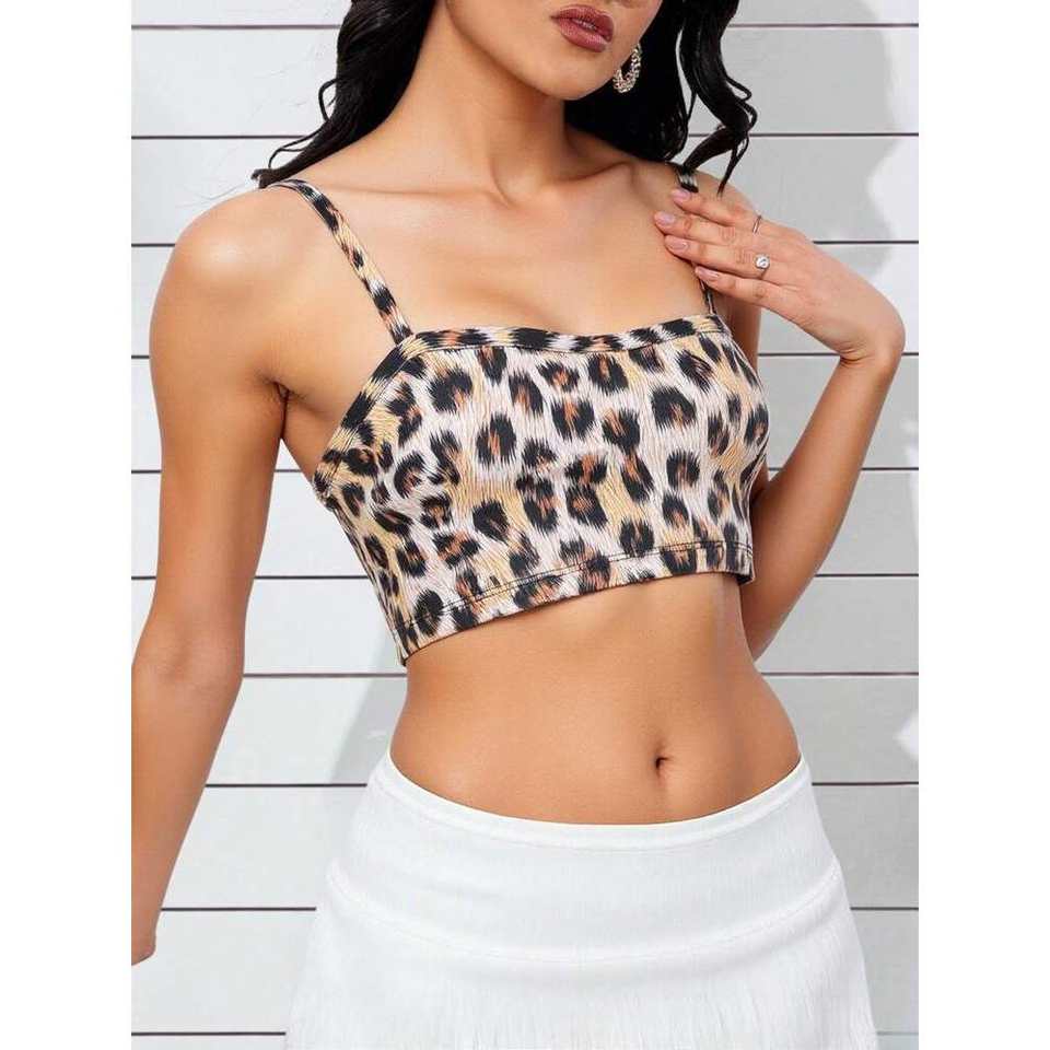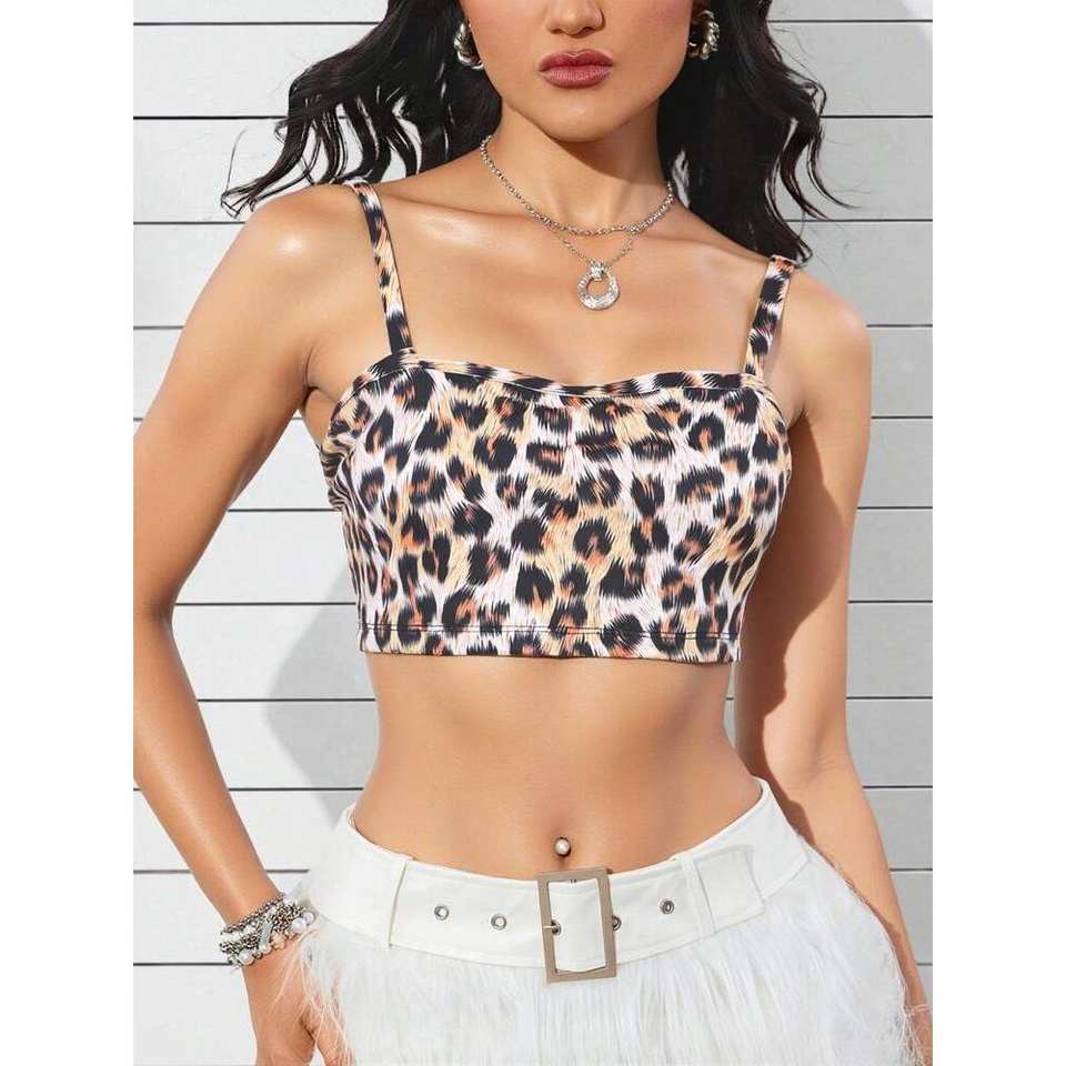 ผ้าพิมพ์ลายเสือดาวลำลองเสื้อครอปสั้นคอเสื้อปรับสายได้และคุณสมบัติยืดหยุ่น