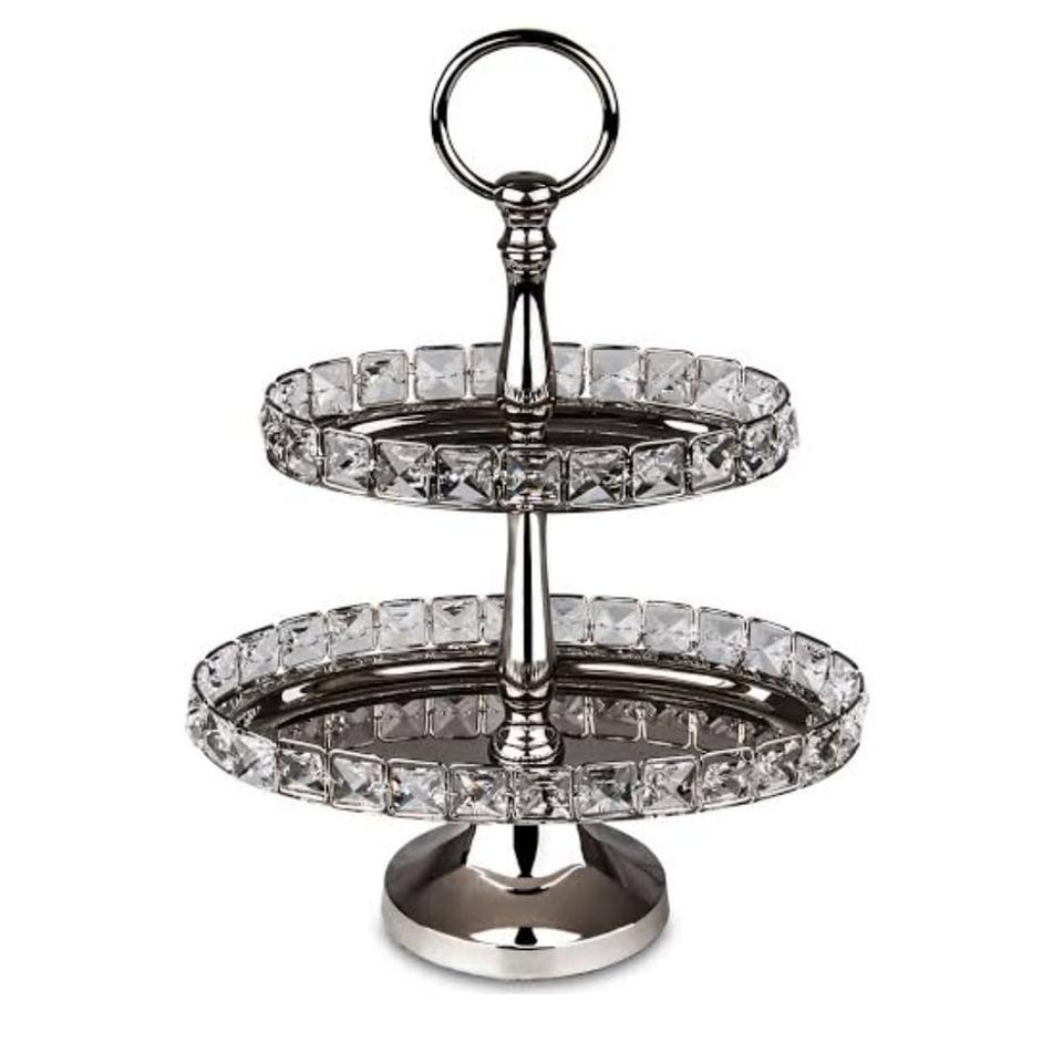 ชั้นวางเค้กโลหะ 2 ชั้น ยอดนิยม ตกแต่งขอบด้วยคริสตัล ชั้นวางผลไม้เคลือบนิกเกิล