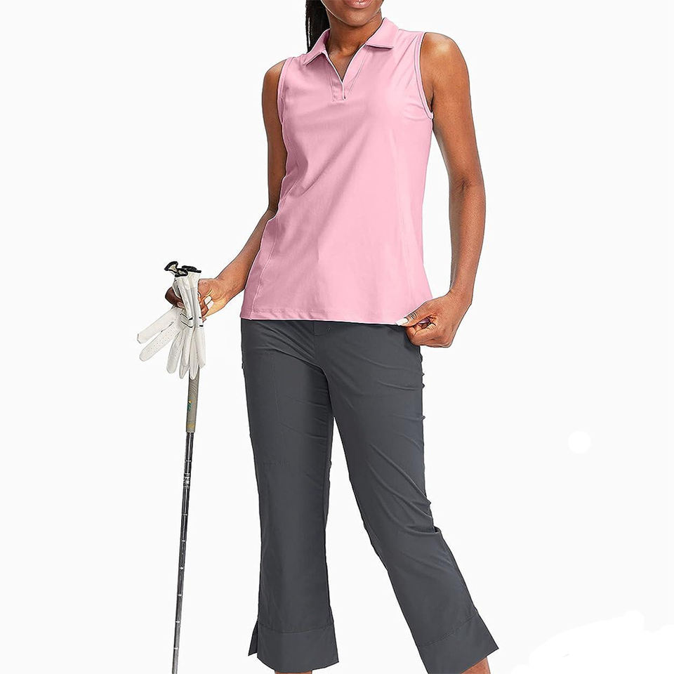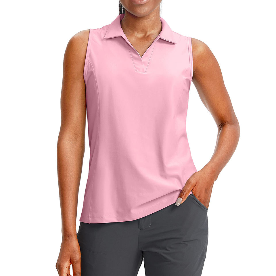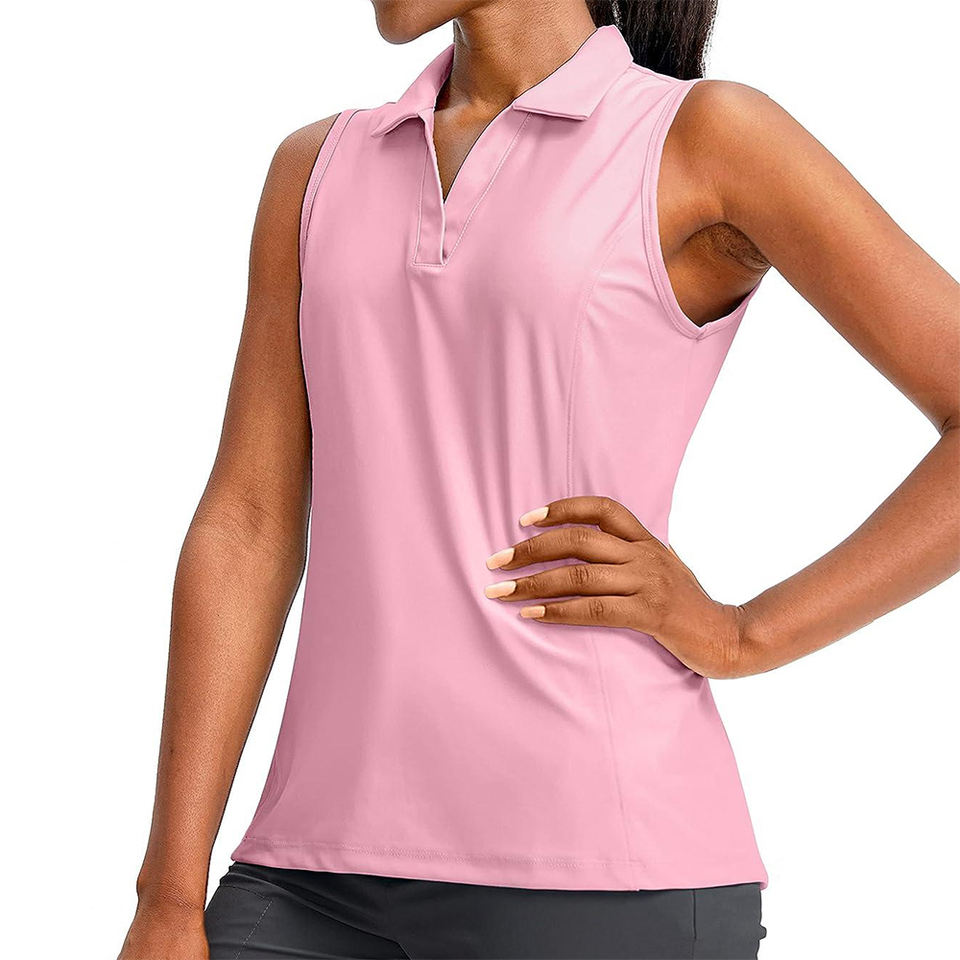 เสื้อกอล์ฟลำลองสำหรับผู้หญิงยอดนิยม สีชมพู ผ้าคอตตอนผสมโพลีเอสเตอร์ ทรงวี คอวี ทรงสปอร์ต ทรงปกติ ไม่มีแขน