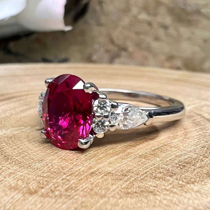 แหวนหมั้นอัญมณีสีชมพูทรงรี14K แหวนเพชรสีขาวทองประดับเพชร
