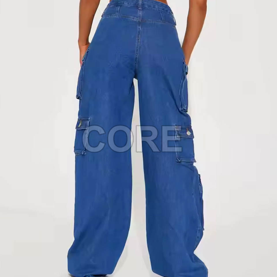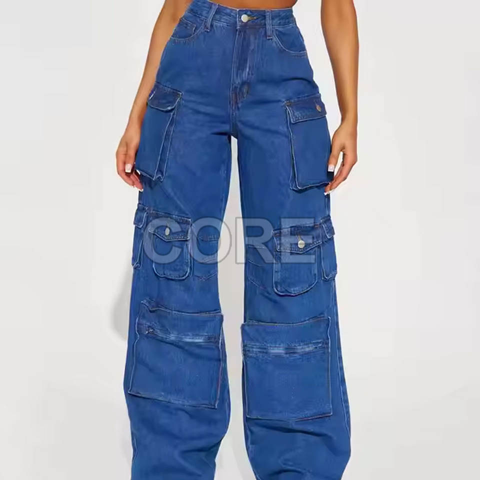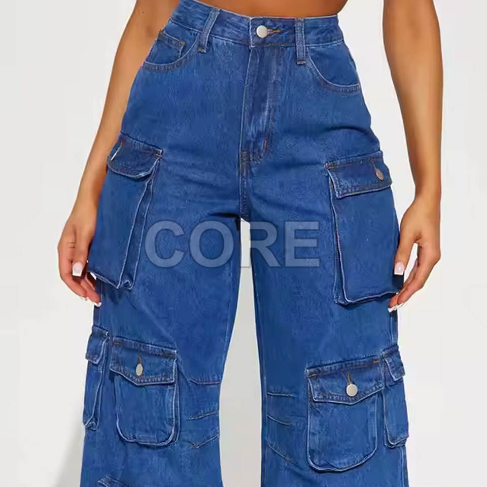 กางเกงยีนส์คาร์โก้มีกระเป๋าหลายกระเป๋าของผู้หญิงกางเกงยีนส์คาร์โก้หลายกระเป๋าขนาดพิเศษ