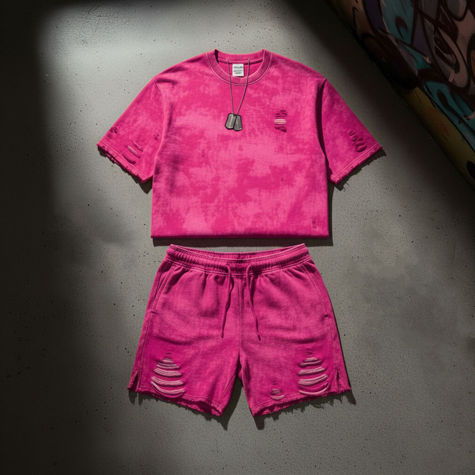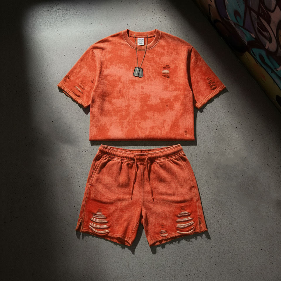 เสื้อยืดโอเวอร์ไซส์และกางเกงขาสั้นชุดเซ็ต 2 ชิ้น สไตล์ฮิปฮอปสุดเทรนด์ ใส่สบาย เหมาะสำหรับวิ่งออกกำลังกาย ชุดเซ็ตขาสั้นผู้ชายแบบดิสเทรส