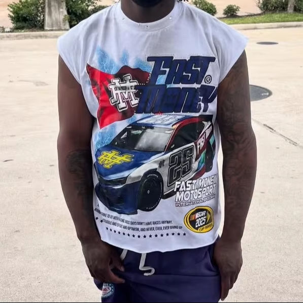 เสื้อยืดแขนกุดผู้ชายสุดฮิต แต่งลายกราฟิก ประดับเพชรเทียม สไตล์ซันเฟด ดีไซน์ขาดๆ ทรงหลวม ตัดสั้น พิมพ์ลาย DTG